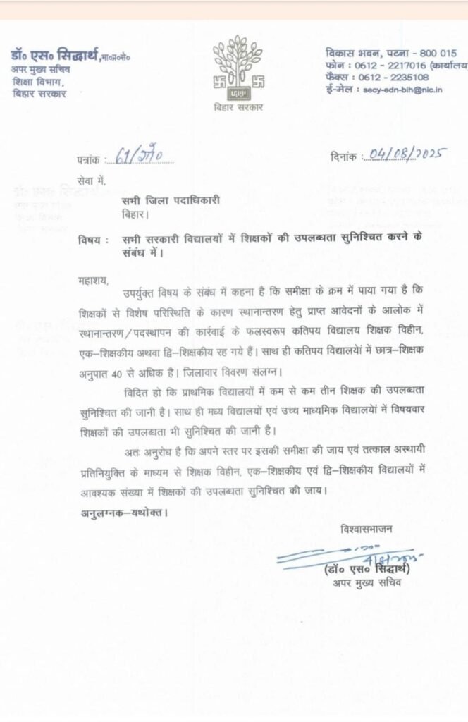 बिहार सरकार के शिक्षा विभाग ने राज्य भर के सभी सरकारी स्कूलों में शिक्षकों की उपस्थिति सुनिश्चित करने हेतु एक महत्वपूर्ण आदेश जारी किया है। अपर मुख्य सचिव डॉ. एम. एस. सिद्धार्थ द्वारा 4 अगस्त 2025 को सभी जिलाधिकारियों को संबोधित यह पत्र शिक्षकों की गंभीर कमी और इसके चलते छात्रों की पढ़ाई पर हो रहे प्रभाव को लेकर चिंता जताता है।