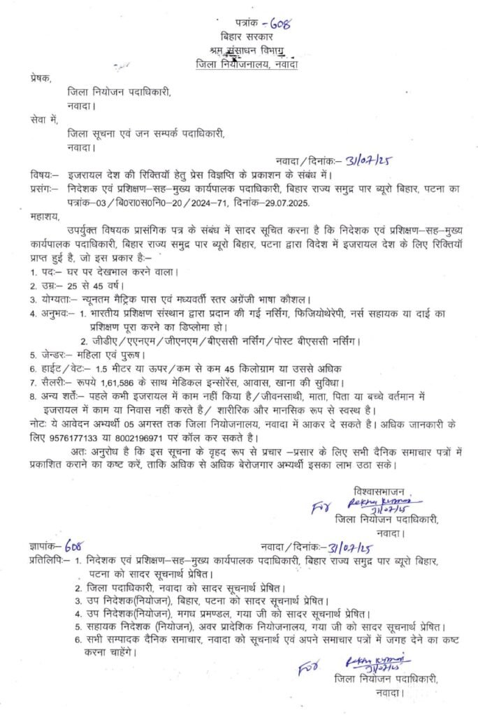 इस संबंध में जिला नियोजनालय, नवादा ने एक सूचना जारी की है जिसमें इज़राइल में रोजगार हेतु महिला व पुरुष नर्सिंग स्टाफ, फिजियोथेरेपिस्ट व स्वास्थ्य सहायक पदों के लिए आवेदन मांगे गए हैं।